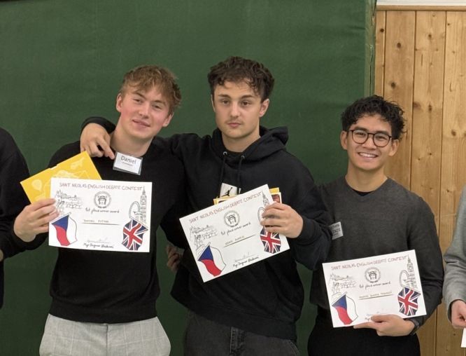 V pátek 5. prosince 2025 se naši studenti zúčastnili debatní soutěže v anglickém jazyce Saint Nicholas Debate Contest na ČAO Resslova 5. Tým ve složení Daniel Vytvar (3E), Adam Korejs (3A) a Dominik Tisovský (3A) se umístil na 1. místě. V tomto pořadí (zleva) je vidíte i na fotografii po vyhlášení výsledků.